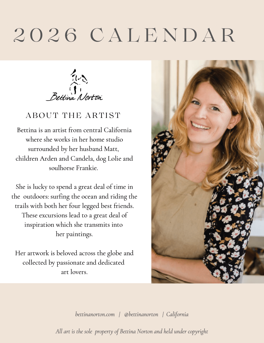 Elevate your home decor with this stunning 12-month calendar featuring Bettina's most beloved paintings. More than just a way to track the date, each page is a piece of timeless art. After the year, you can easily trim and frame the prints to enjoy them for years to come.