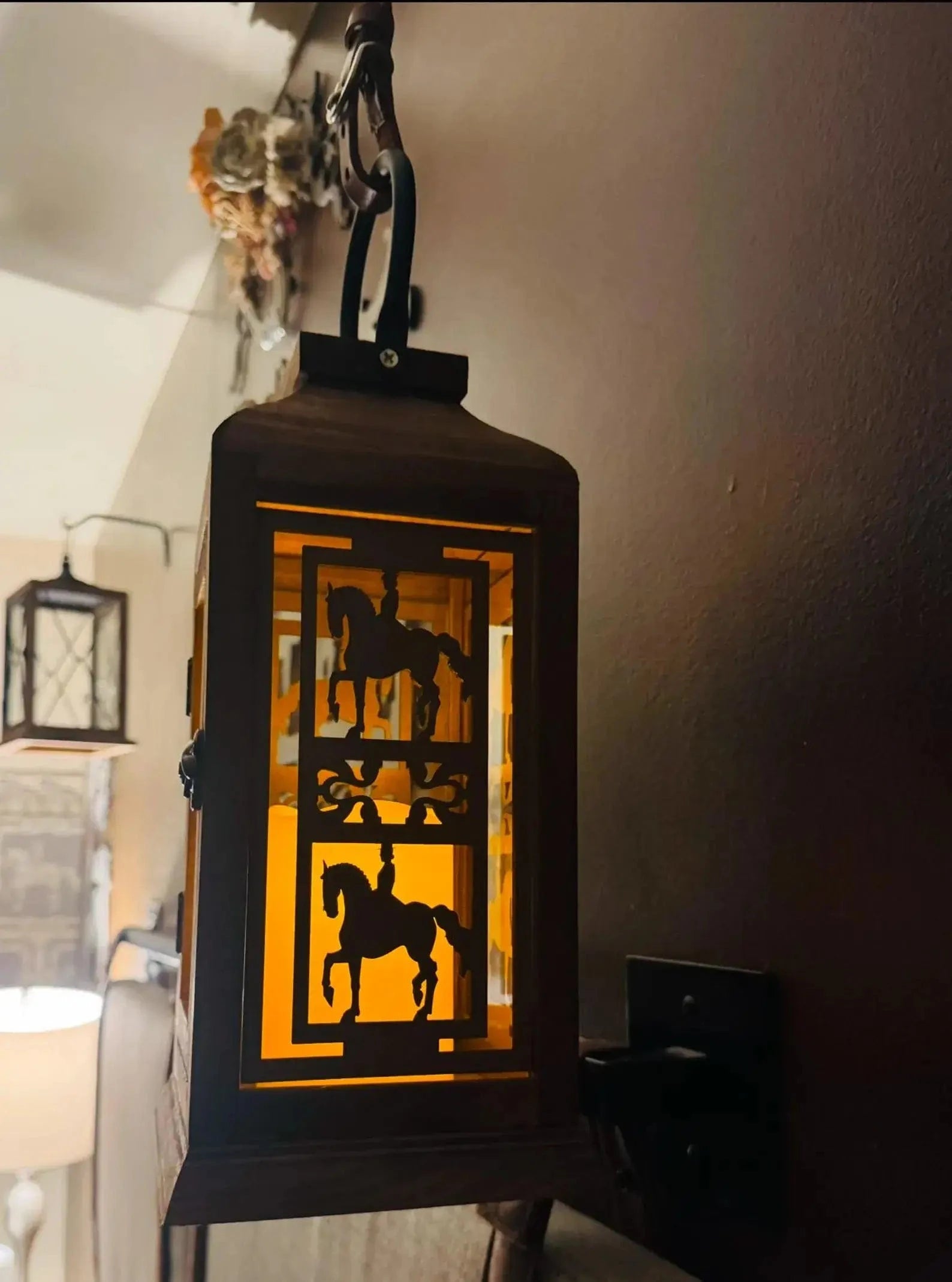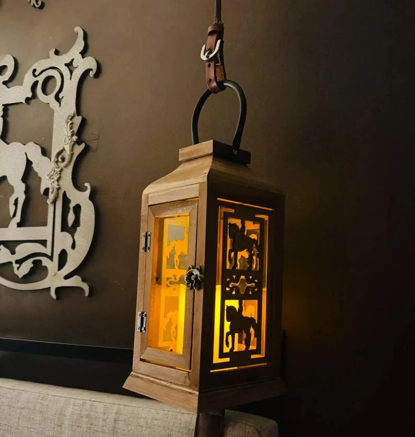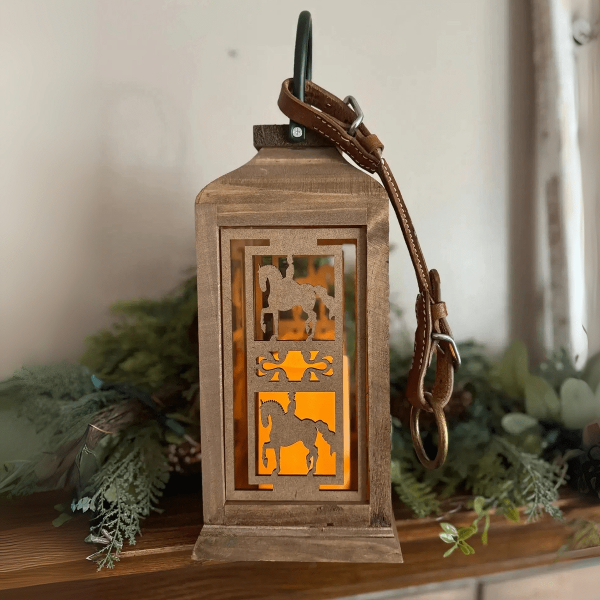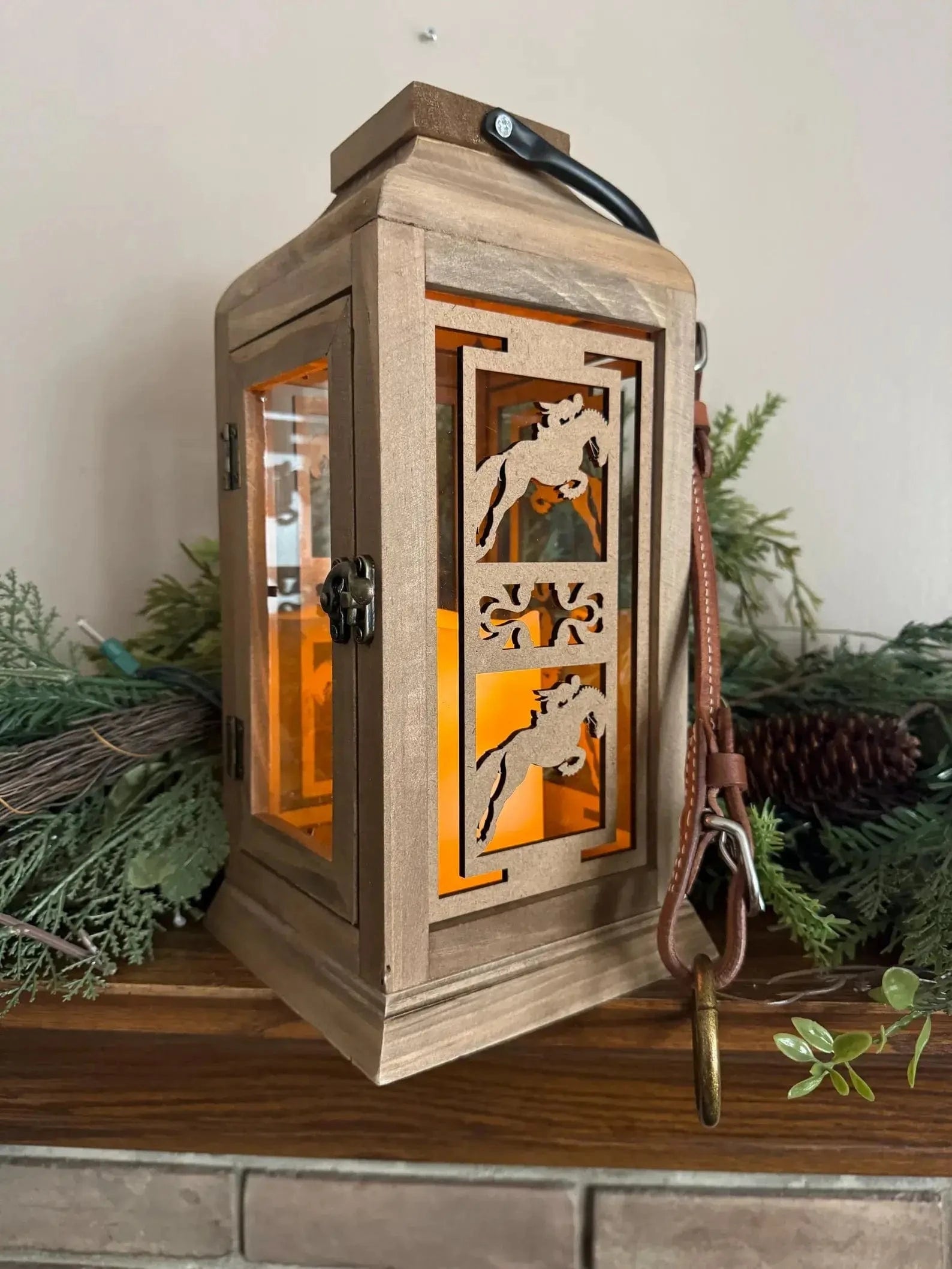 Make a bold equestrian statement, indoors or out, with this 13-inch high wood-designed dressage or jumping horse lantern. This rustic yet beautiful lantern will be a stunning addition to your home or porch.