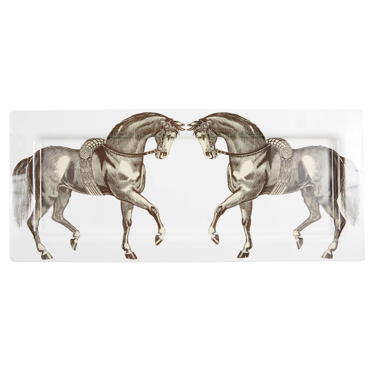 Express your passion for horses with elegance! Crafted from our thickest melamine, this extra-large serving tray is dishwasher safe but not microwaveable. Measuring a substantial 11.75" wide by 27" long, it makes a striking centerpiece for any table.
