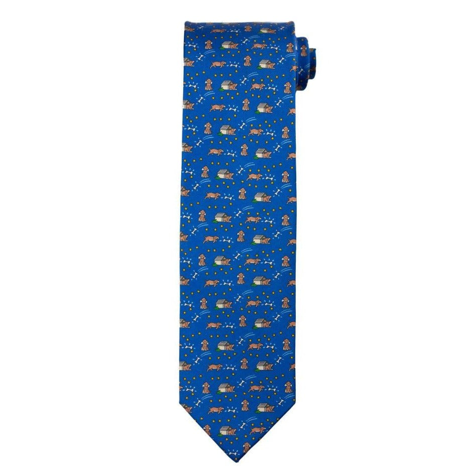 Latest addition to our men’s necktie collection featuring the playful dogs in doghouse design. Handcrafted Italian necktie in a dog motif design.