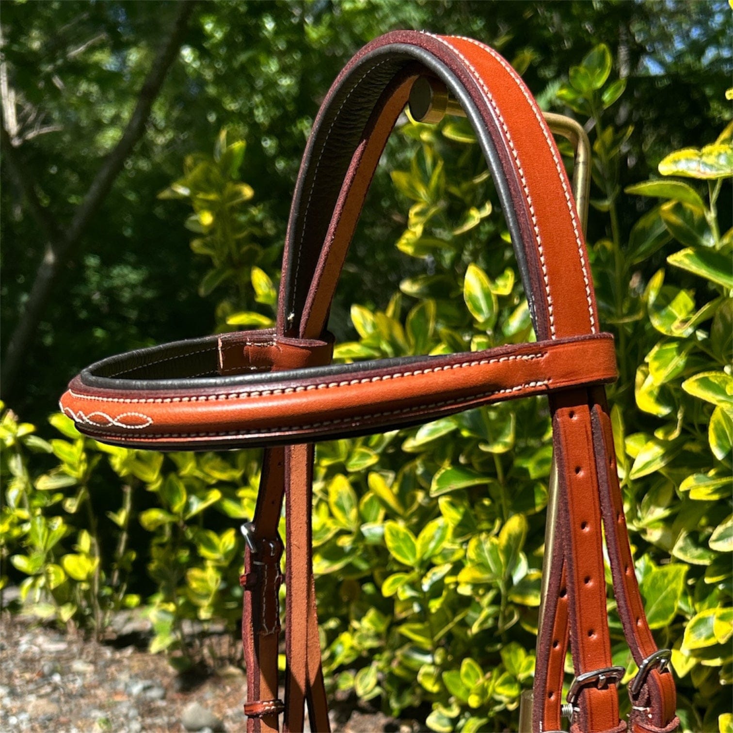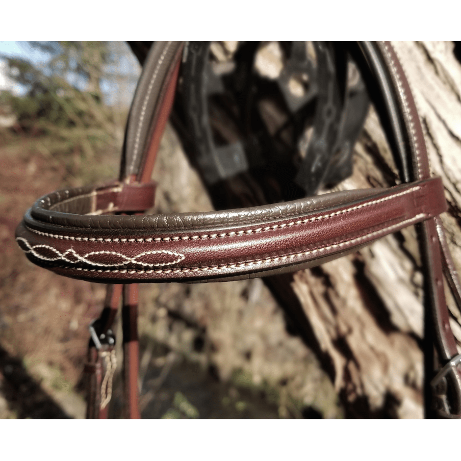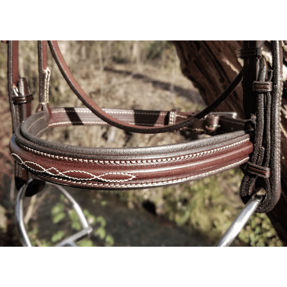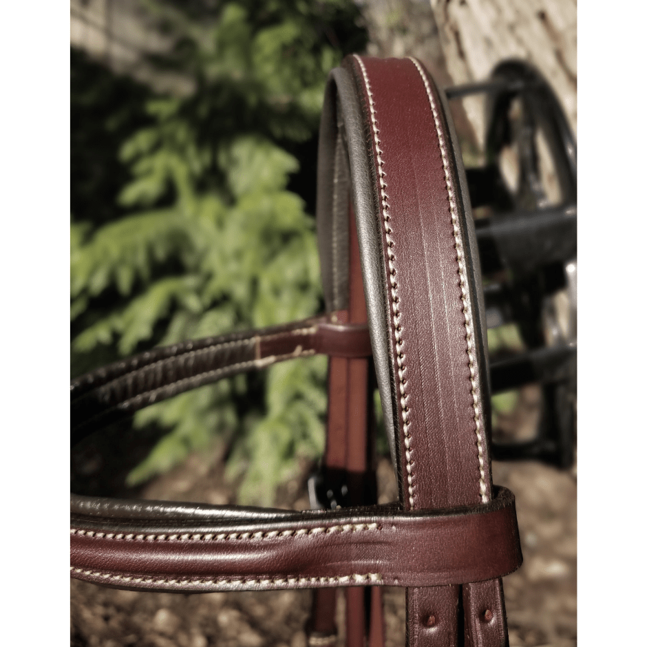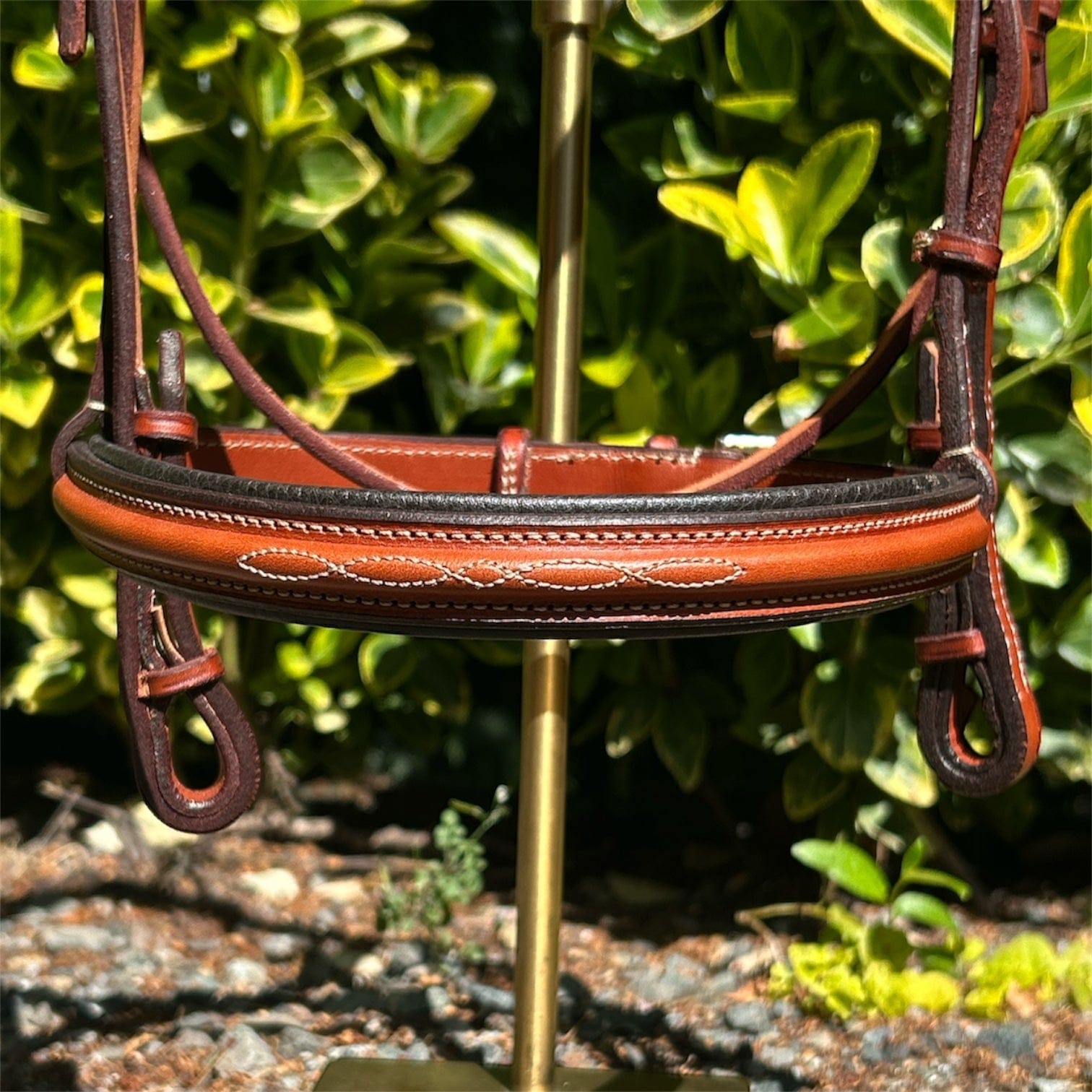 This model features a 3/4" padded noseband which gives a very traditional look. Complete the look with fancy stitching on the noseband and browband. Padded along the inside of the noseband, browband, & crown.