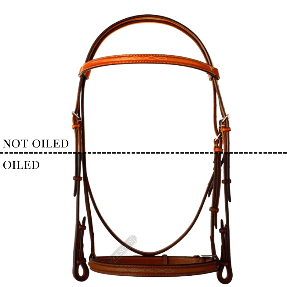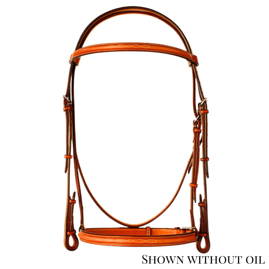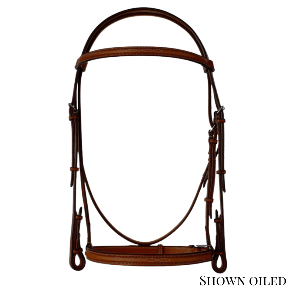 This model features a 3/4" wide fancy stitched noseband & browband. Standard non padded traditional crown.