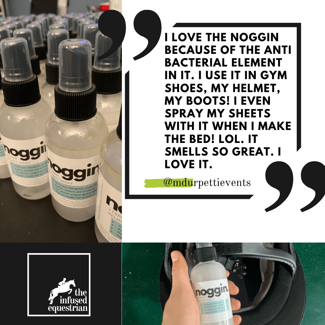 noggin. A Fresh Helmet Spray is the ultimate weapon against odor. It purifies, cleanses and disinfects naturally. We promise you'll love the smell of our spray and will marvel at how it neutralizes odor on contact. So, freshen up your helmet, boots, gloves, shoes, fabrics, blankets, vehicle interiors, and more. noggin. A Fresh Helmet Spray is a four ounce, all-natural, non-toxic ingredient formula that will combat foul odors and bacteria. ADDED BONUS: noggin. A Fresh Helmet Spray supports healthy hair growth too! Directions: Shake the bottle well before use. Spray product directly onto the inside of your equipment and let air dry. Do not swallow. Keep out of the reach of children. Ingredients: Purified Water, Distilled Grain Spirits, Citronella, Lavandin, Lemongrass, Rosemary, Lemon, Cedarwood, Myrtle and Tea Tree grade-A essential oils.