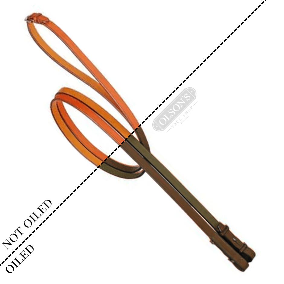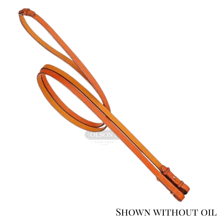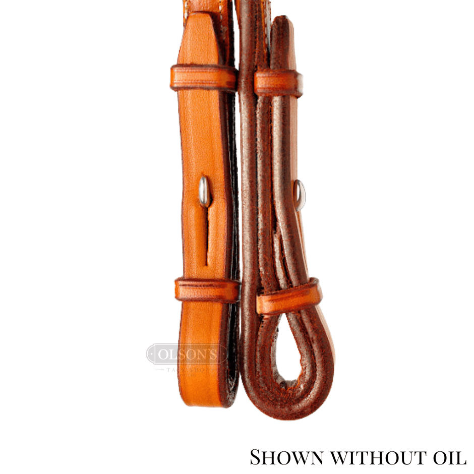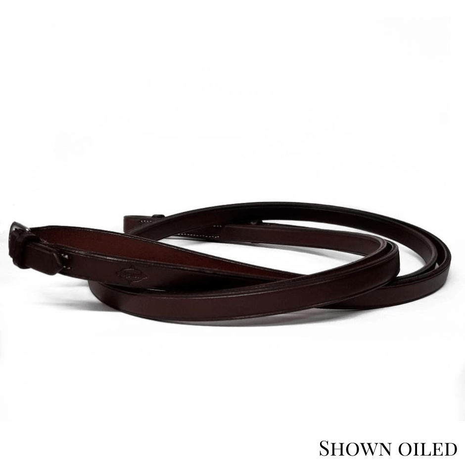 Flat leather pelham reins in 1/2" width made by Edgewood. Hook and loop closures for security and elegance. These reins perfectly match the rest of the Edgewood line as well as many other leather bridles.
