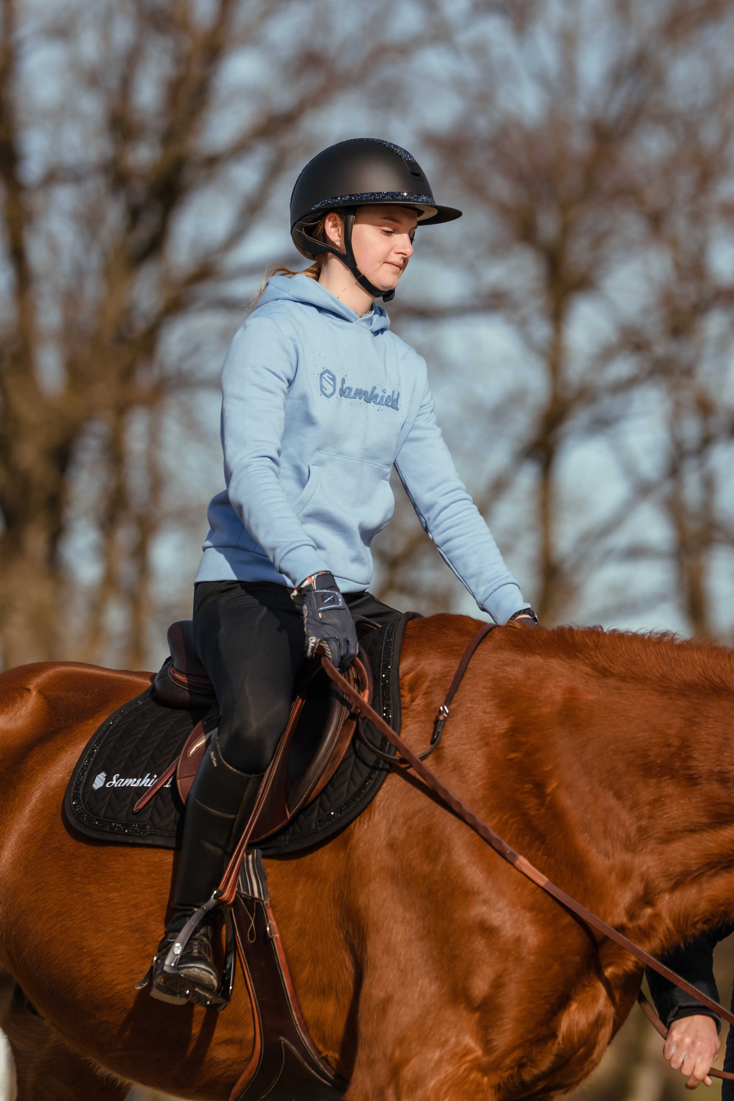 The Samshield camilla winter is a women's hooded sweatshirt designed for warmth and comfort. Made from a stretchy, easy-care material, it's perfect for casual outings or workouts. The hoodie features a Swarovski crystal-decorated logo on the front and a satin printed logo on the hood. The sleeves and torso have a ribbed effect for added style.