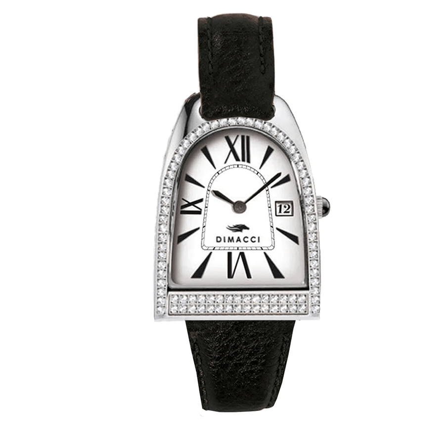 Stainless steel case (4 cm height) in the shape of the classic English stirrup. The leather strap fits comfortably around the wrist.