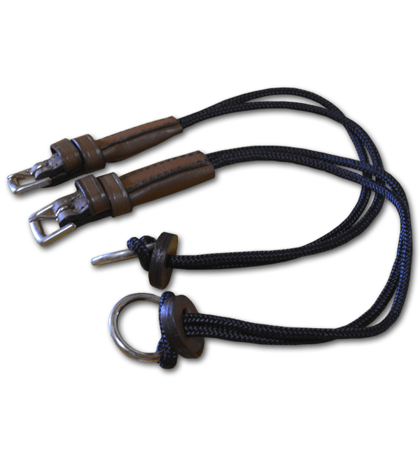Made of high quality Stubben leather in combination with black nylon ropes. The rings and buckles are made of stainless steel. The rings are not stitched on to the nylon ropes but fixed with a rope loop only. Just slide the rope down through the gag bit, then loop the rope over the ring. No more screws or stitching! Dark Brown