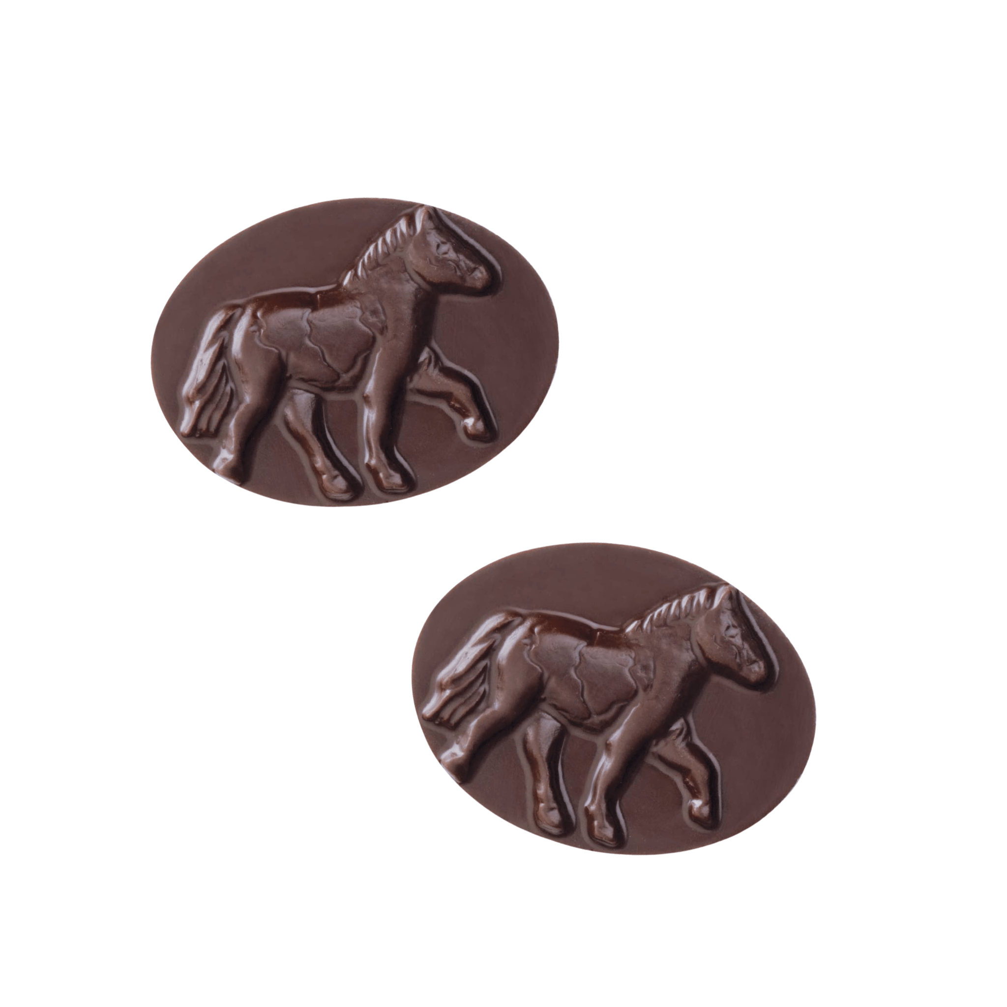 Chocolate candies with horse designs on a stone surface