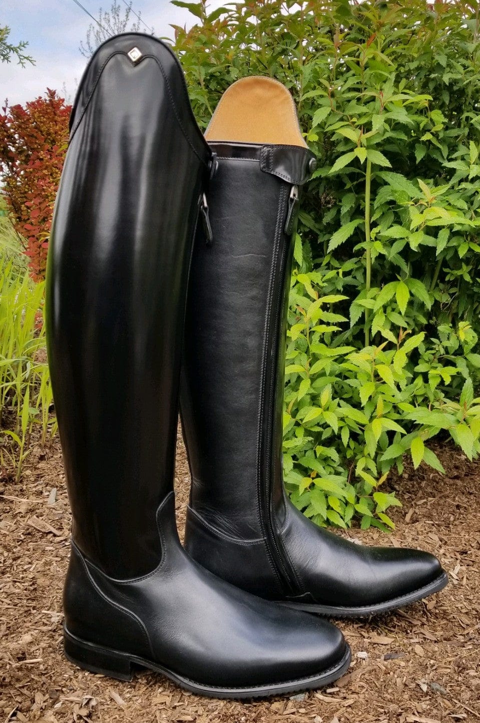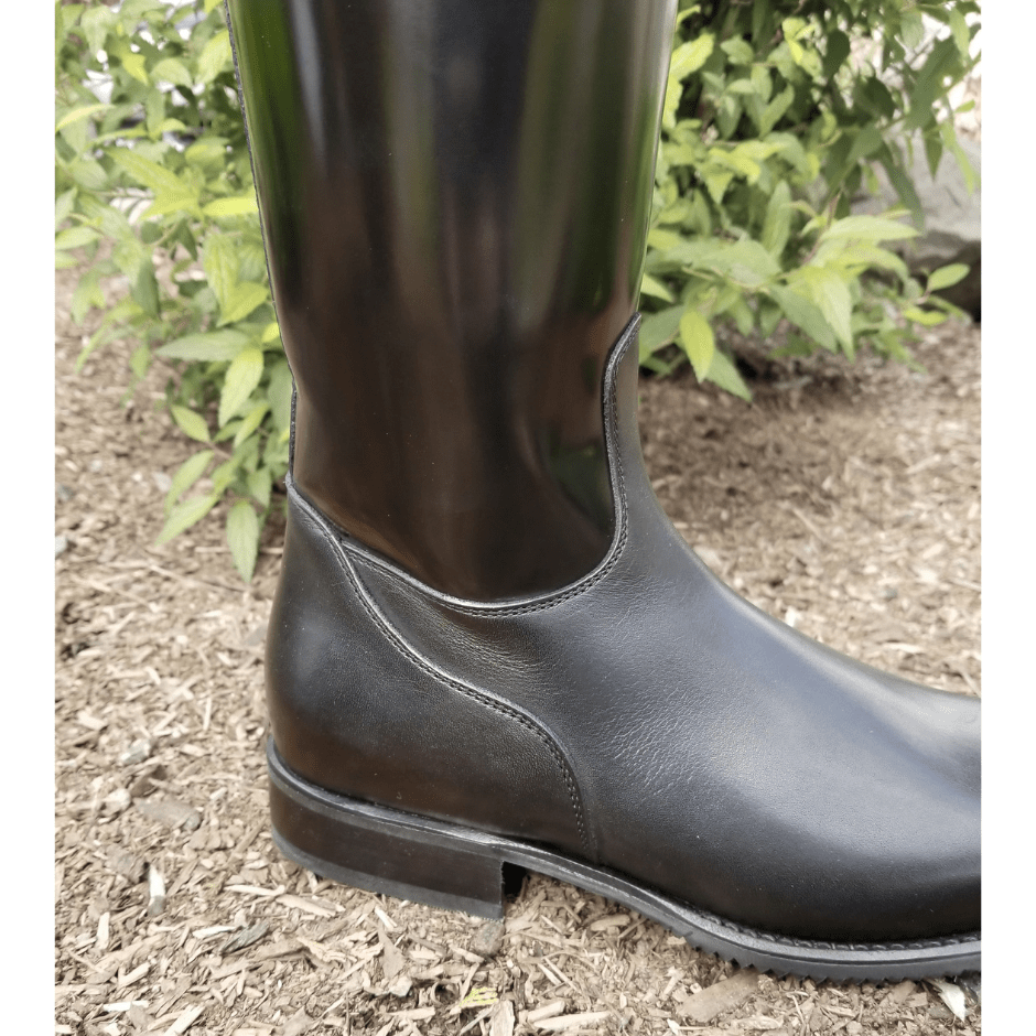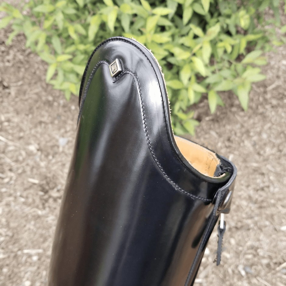 An elegant dressage boot with a classic profile. The Raffaello is hand crafted from fine Italian calfskin and are reinforced through the outer calf with four layers of leather. This allows for a stiff lower leg and the steady contact sought after by dressage riders. The exterior calf is made from beautifully shiny "brushed" calfskin leather. This creates a high shine appearance that lasts for the entire life of the boots. The top "Rondine" curve is a subtle accent to give these boots a custom feel.