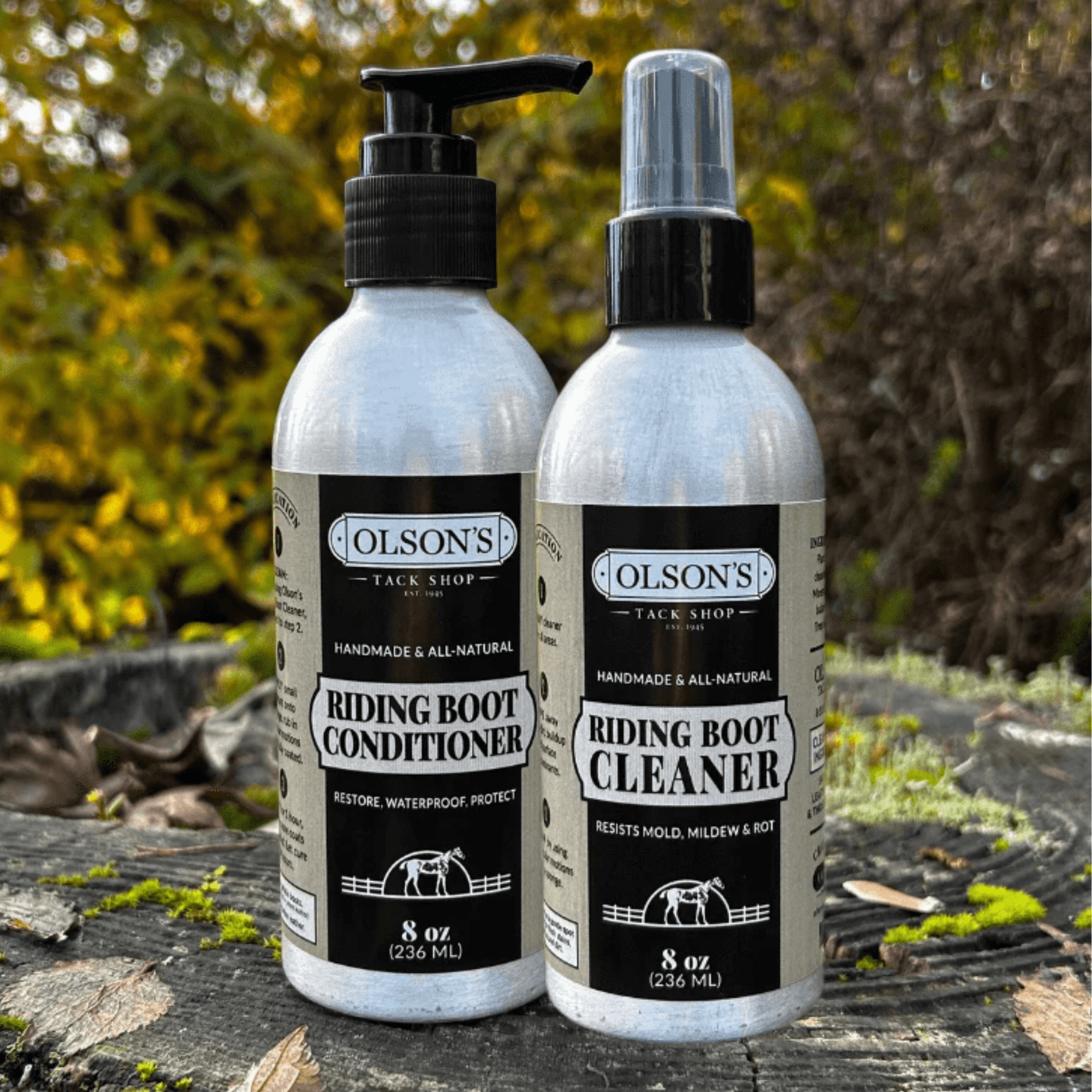 Olson's leather care kit including a spray boot cleaner bottle, cream, and sponge on a table with shoes in the background.