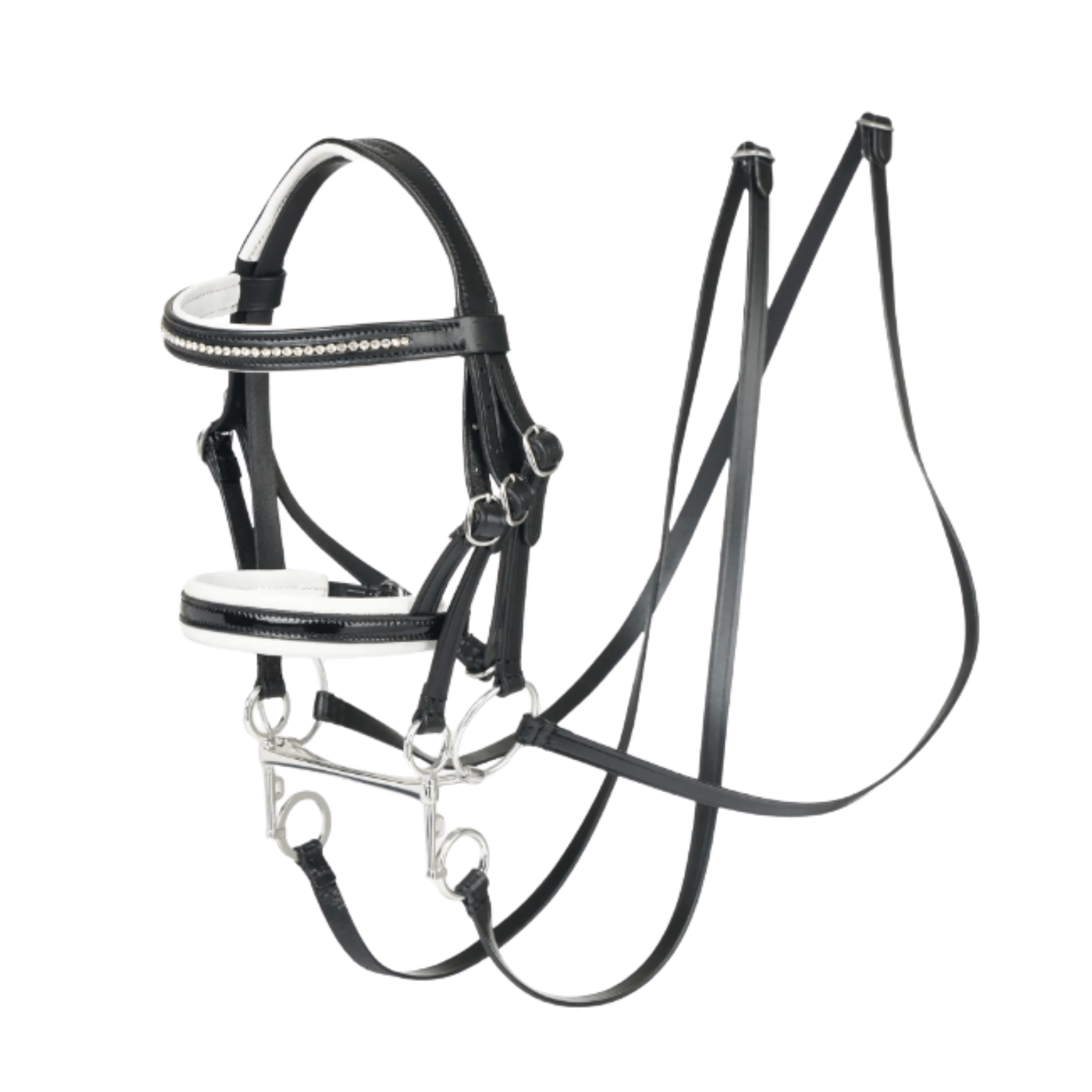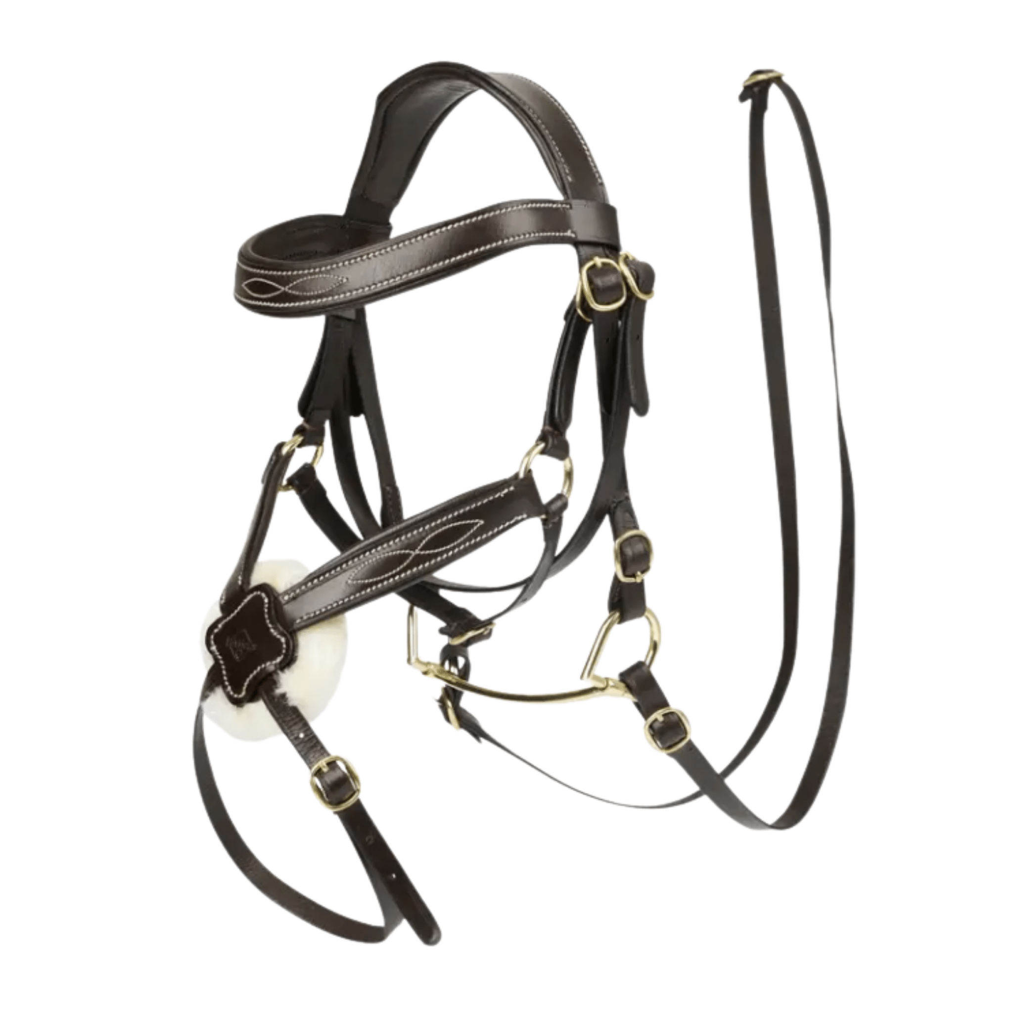 This Lemieux hobby horse bridle is perfect for young riders to learn how to tack up. Made from leather and complete with adjustable buckles, this bridle features a real metal bit and leather reins. The decorated browband adds a touch of style, while the adjustable parts offer a realistic experience. Suitable for ages 3+, this bridle is a great tool for learning.