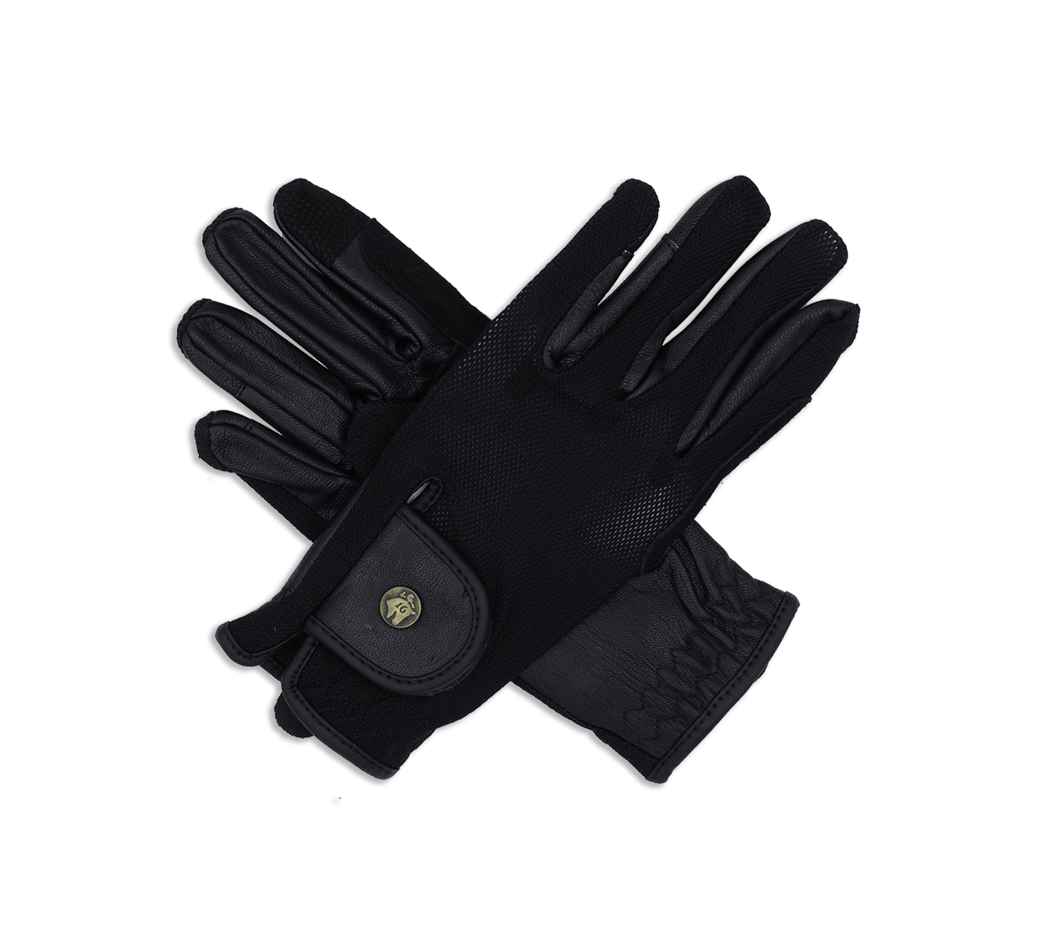 The palms are built from genuine goat leather, with reinforced suede grip patches at rein contact points. The outer layer of stretch mesh or jersey works with the natural movement of your hands, providing comfort and breathability. Secured with an easy velcro closure, finished with digital touch screen patches for your devices.