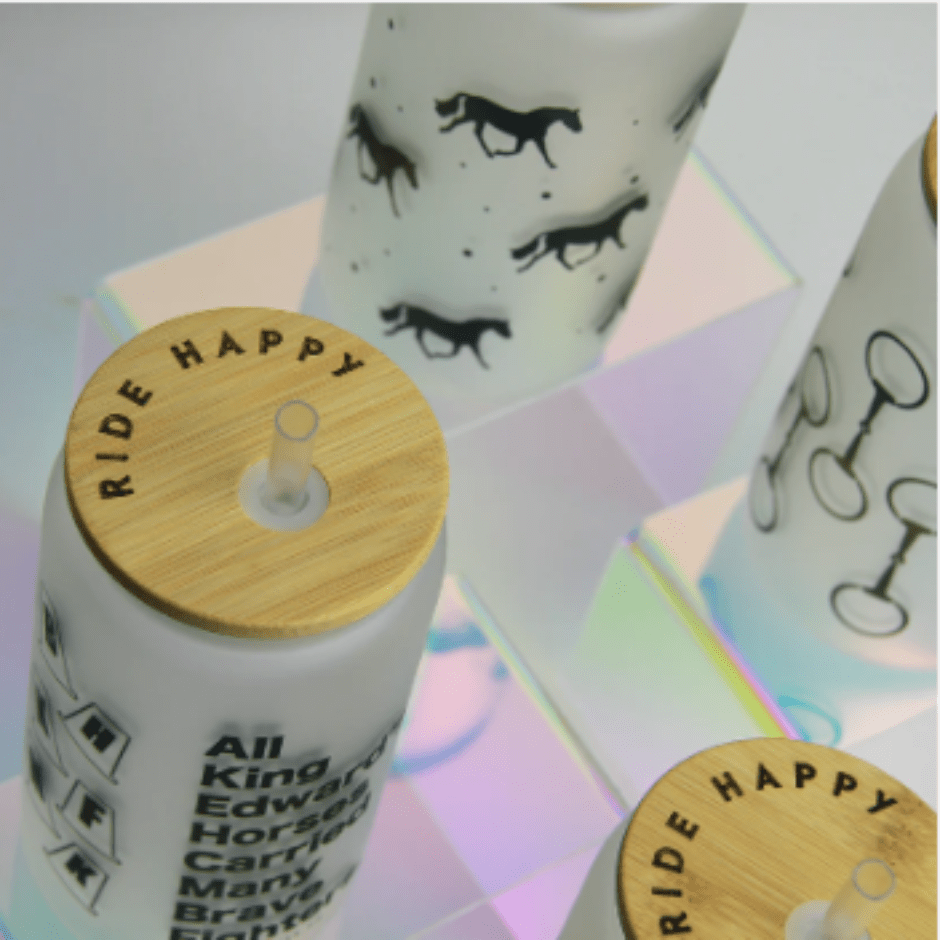 Introducing the Hunt Seat Paper Co. Glass Tumbler. Take a sip from our dressage inspired design, featuring a 360 print pattern with "Ride Happy" engraved on the lid. With a capacity of 16 oz, this sustainable, ecofriendly tumbler comes with a bamboo lid and reusable straw. The perfect gift for the chill equestrians in your life, or for yourself to find zen at the barn.