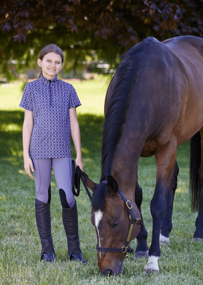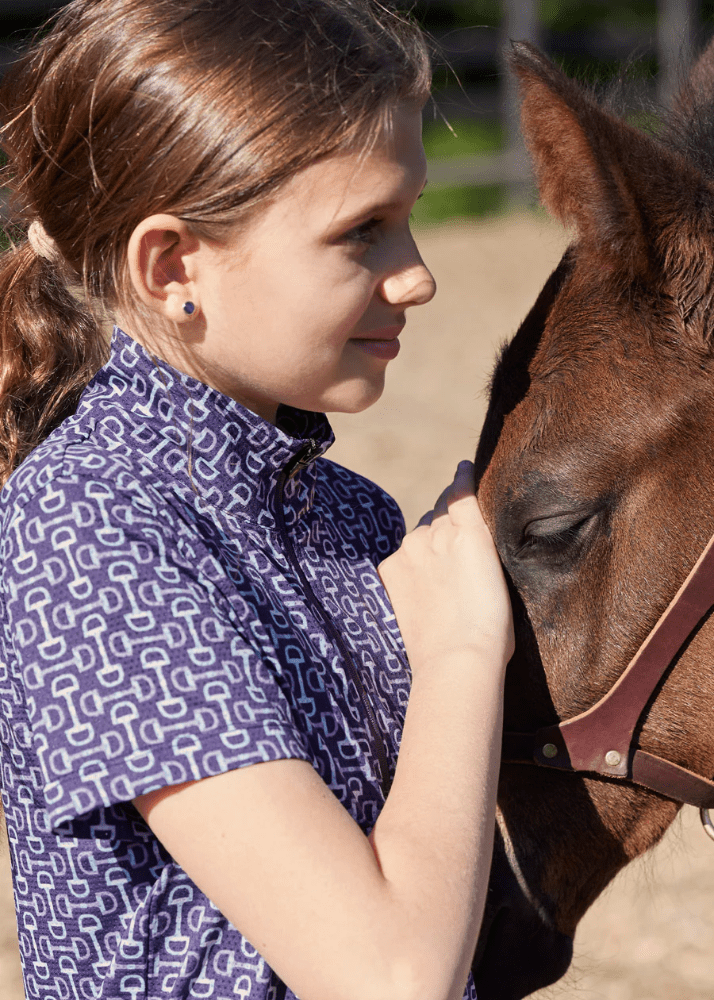 Let your young rider show off their pony passion with the Kerrits Kids Ice Fil Lite Short Sleeve Riding Shirt. This ultra-lightweight and breathable shirt is perfect for hot summer rides, featuring fun, equestrian-inspired prints that kids will love. From bold white horses to playful snaffle bits, these designs not only look great but also cleverly help hide dirt and pony slobber. Made with cooling and sun-shielding Ice Fil technology, this shirt keeps kids comfortable and protected all day long. The long zip allows for adjustable ventilation, and the featherlight four-way stretch fabric provides freedom of movement for active riders.