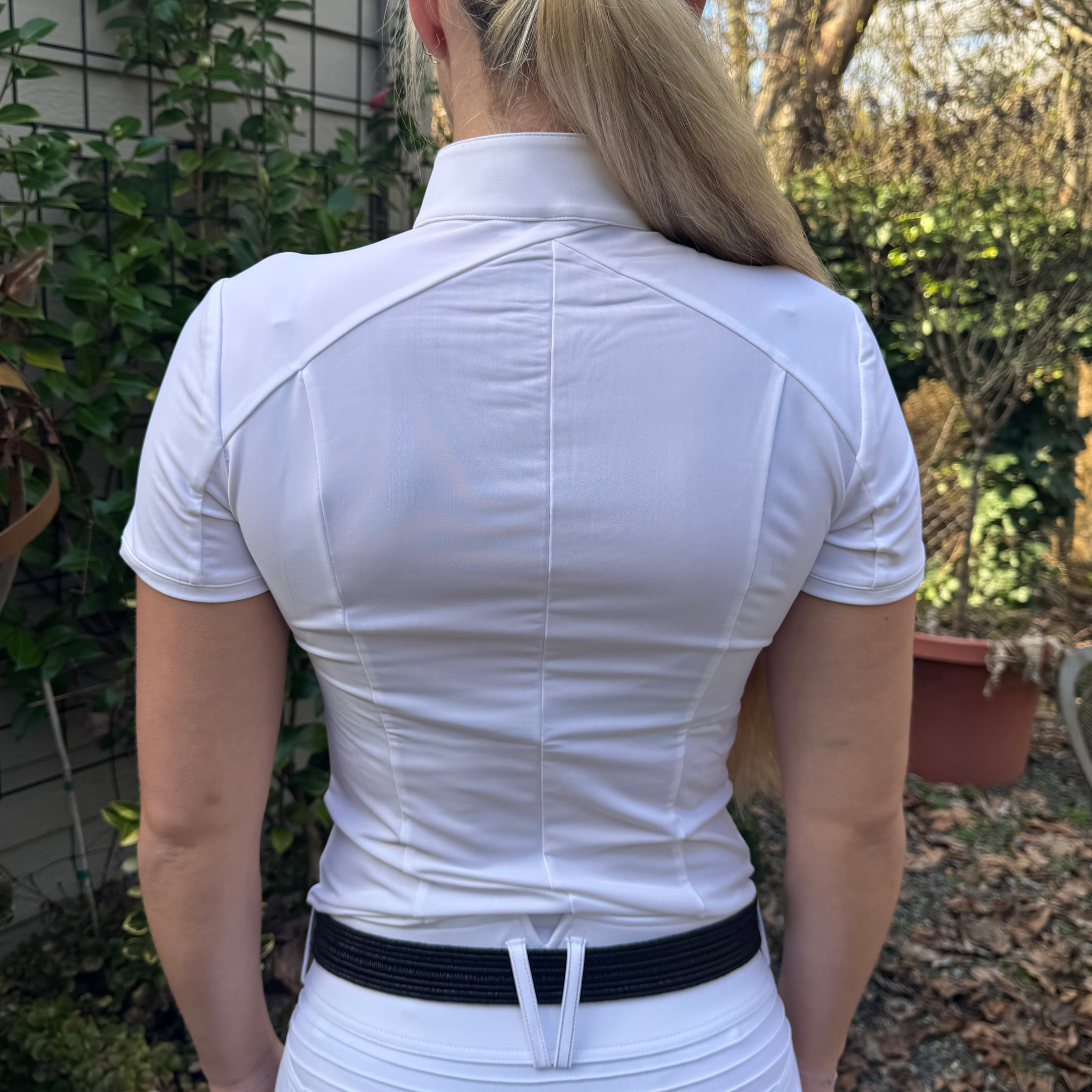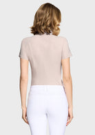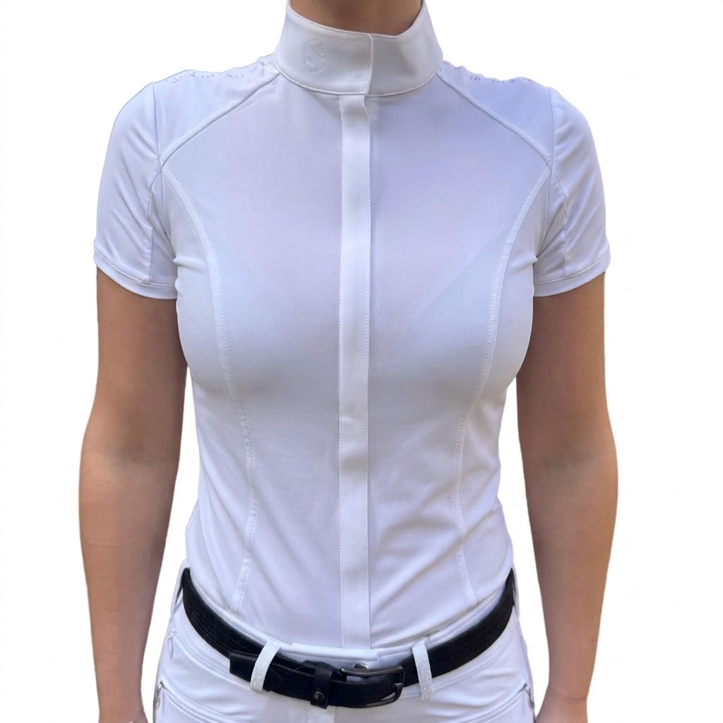 The Samshield Gretta Metal Dots is a refined women's competition shirt that expertly blends sporty aesthetics with high-performance technical features. It features a sophisticated two-tone design with a full-length bib front and a concealed zipper for a sleek, professional appearance in the show ring.