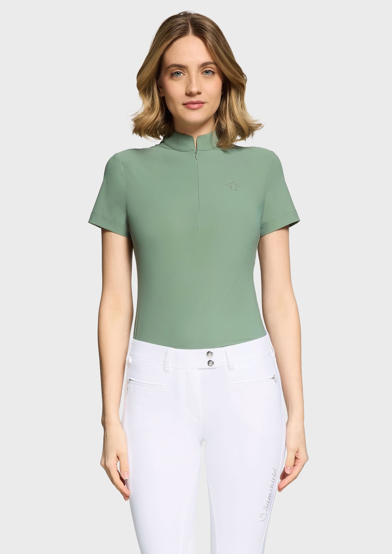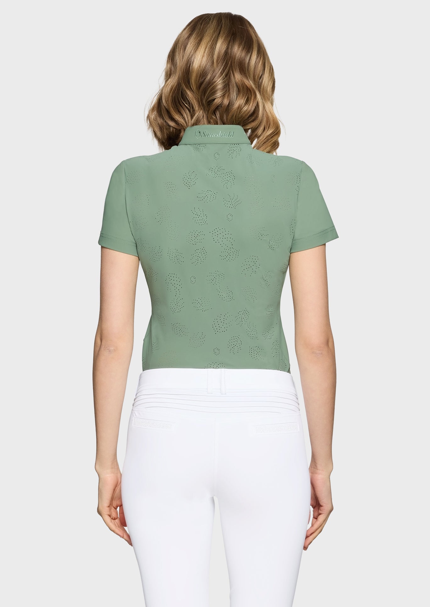 The Samshield Bella Crystal Ferna is a technical women's training top designed for superior performance and elegance in the saddle. It features a tailored fit with a sophisticated perforated leaf decor and an invisible zipper for a seamless equestrian look.