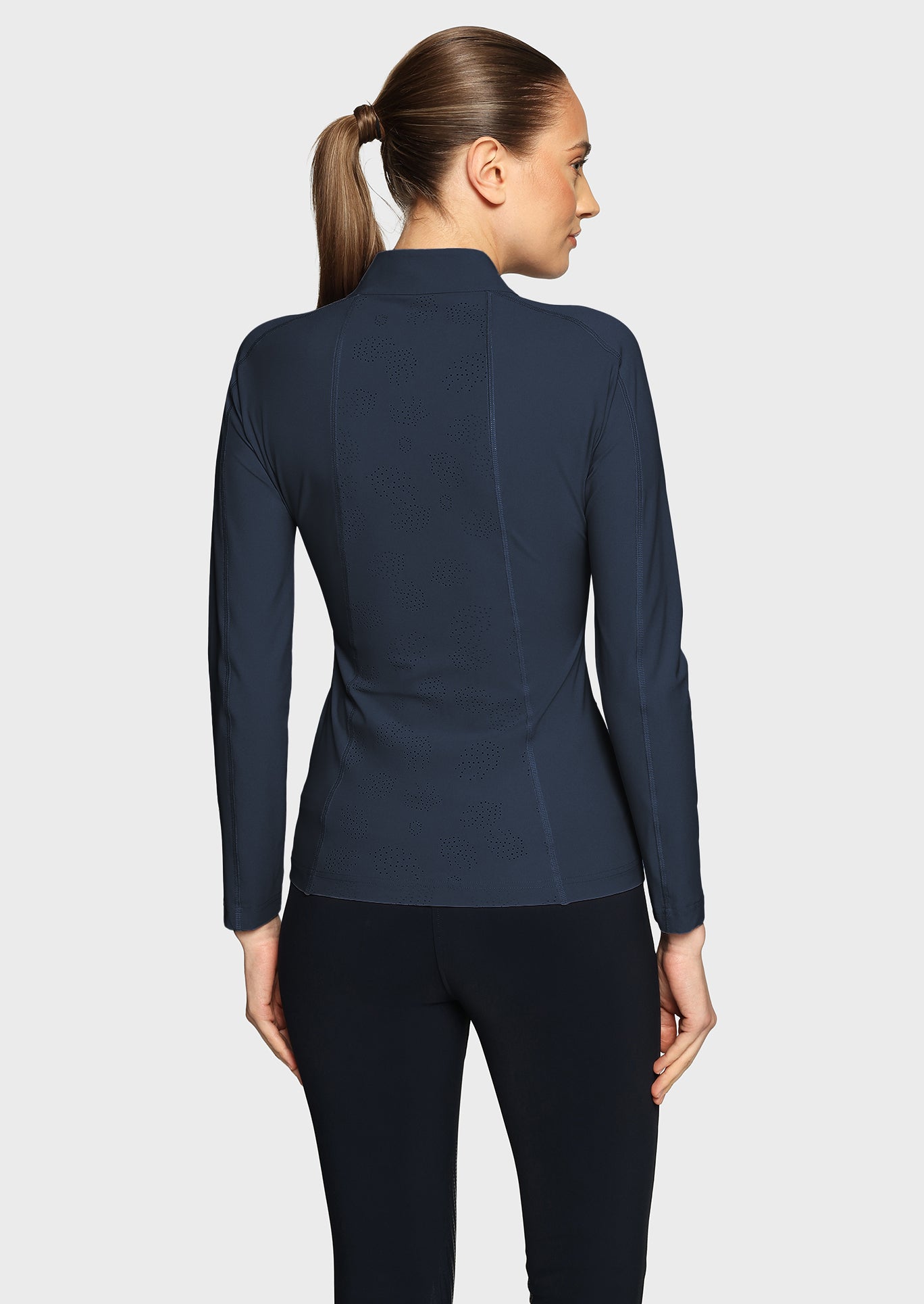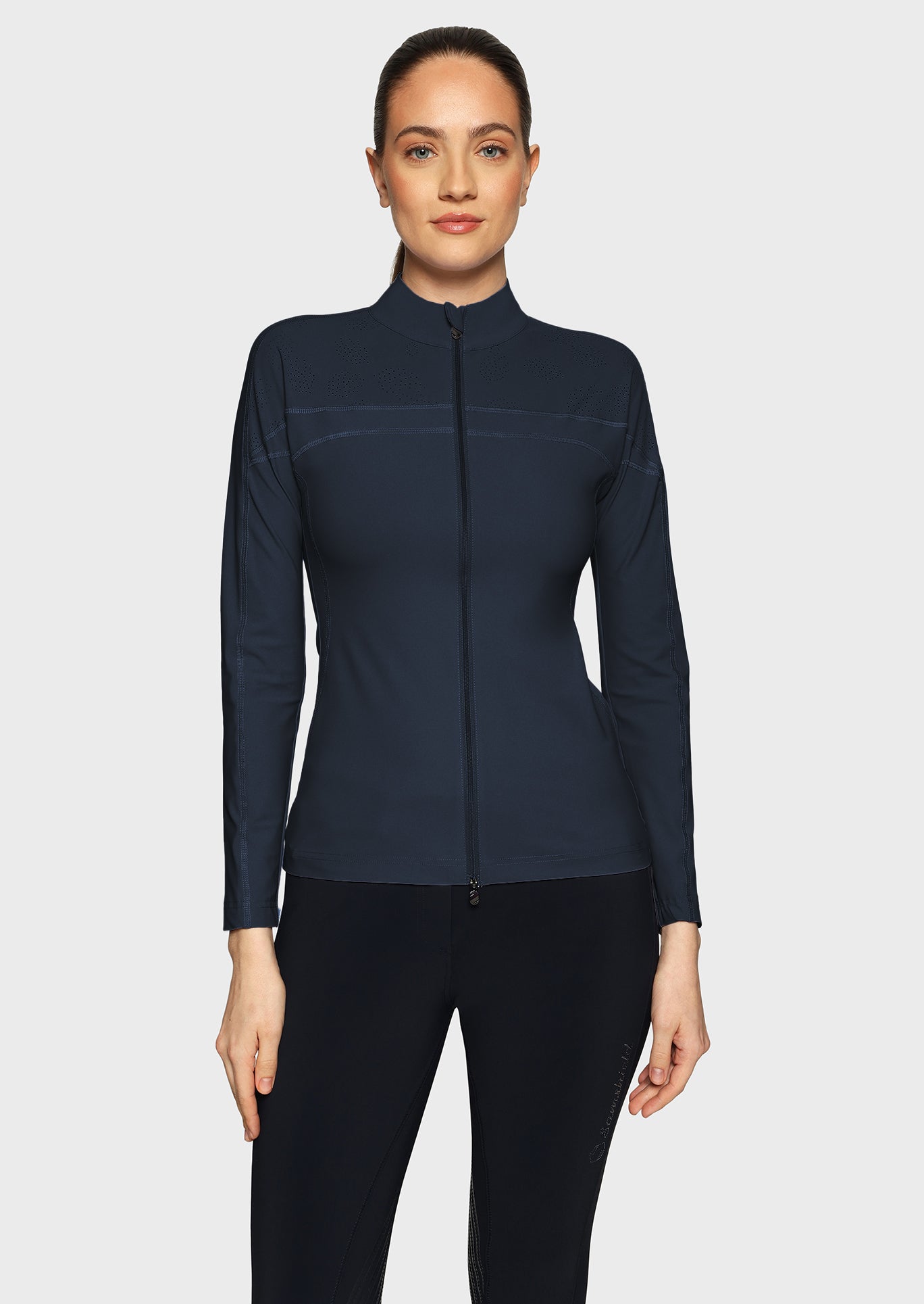 The Samshield Evelya is a high-performance women's long-sleeve training top engineered for comfort and durability. It features a full-length zipper with a custom blazon puller and stylish perforated fabric accents for enhanced ventilation.
