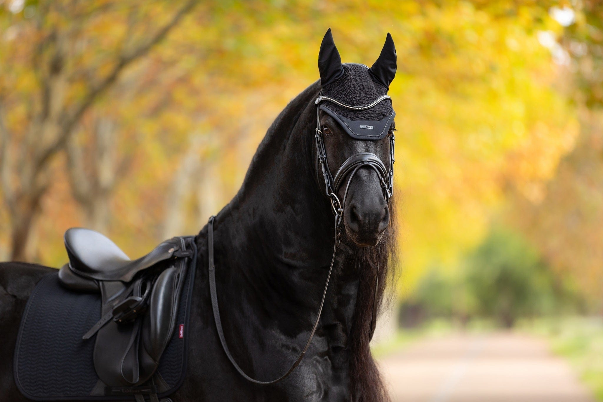 Top off your riding ensemble with the LeMieux Essence Collection Ear Bonnet, designed for pro riders with both protection and style in mind. The 100% cotton crochet veil is handmade with four-way stretch crochet and a smooth softshell patch, ensuring a secure and close fit under the bridle. Finished with sporty matte silicone print branding, the face veil also features soft, comfortable elastane ear fabric to protect your horse's ears from flies, dust, and distractions.