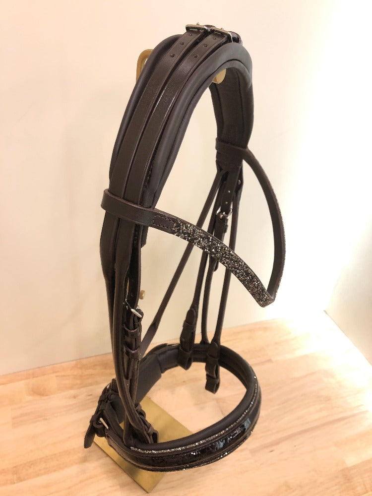 Otto Schumacher Munchen Feel Good Rolled Double Bridle in Brown with Brown Patent Animal Print and Fineline Crystal
