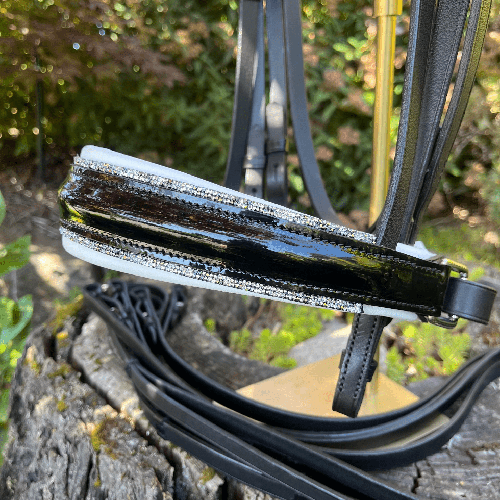 - White padded caveson with crystal Swarovski fineline piping and the softest padded crank caveson available