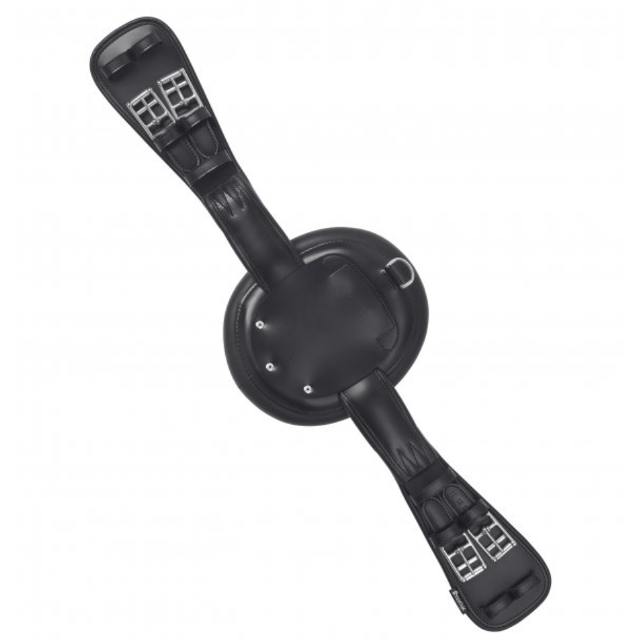 The new RP Dressage girth has an eye-catching look. Developed to fit both horses and ponies, it features a specially modified dressage girth that slides inside an innovative, resistant round-shaped panel. The benefits are: it eliminates almost all lateral movements because the girth slides inside the special panel; the pressure is evenly distributed over a larger surface; the special shape of the panel, characterized by a round contour on the outside and three oval inserts inside, all made in extremely soft material, creates an air cushion to further reduce the pressure. The loops for the girth straps further improve its fitting properties.Β