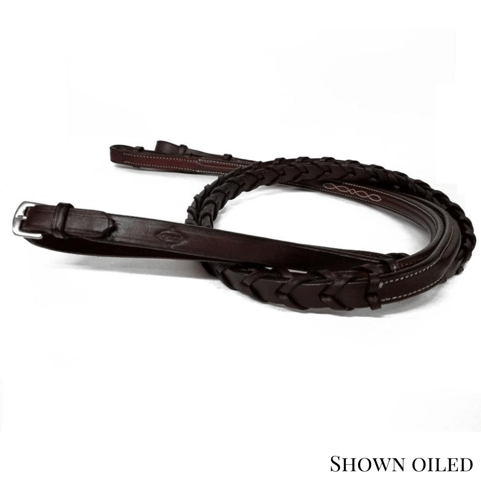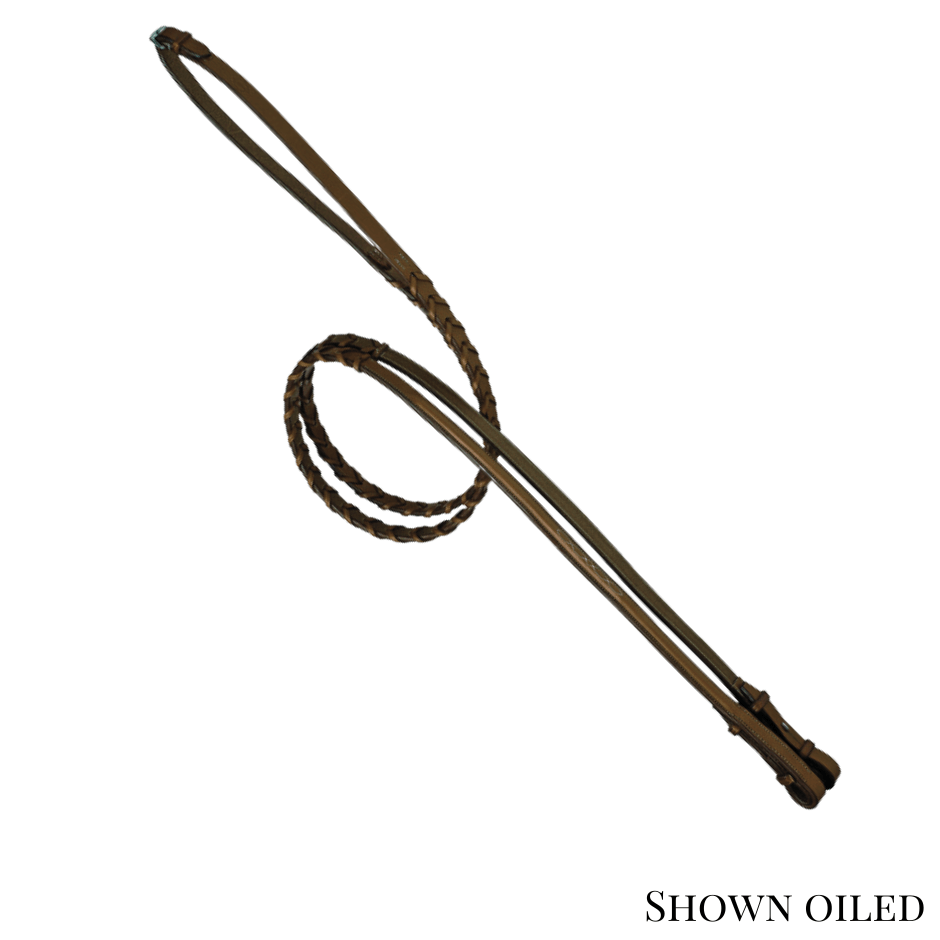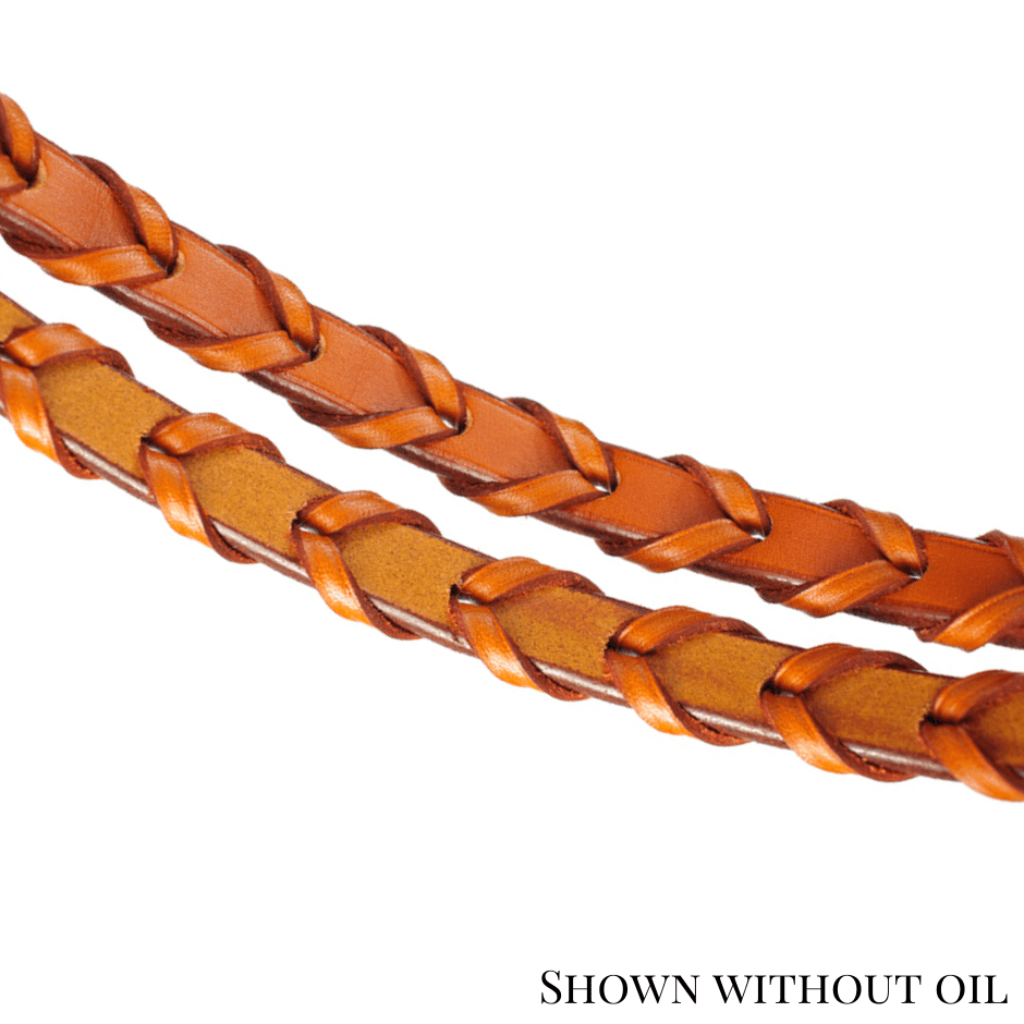 Fancy stitched leather laced reins in 5/8" width made by Edgewood. Hook and loop closures for security and elegance. These reins perfectly match the rest of the Edgewood line as well as many other leather bridles.