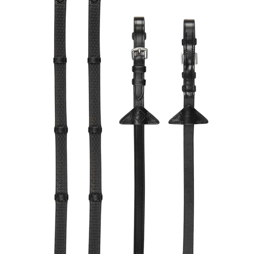 Experience superior comfort and control with LeMieux Soft Rubber Reins with Stoppers. Lightweight and flexible, these reins are designed to be easy to use and allow for consistent contact. The nylon lining prevents stretching, while the leather stoppers provide added grip. Perfect for lower-level riders or fast work.