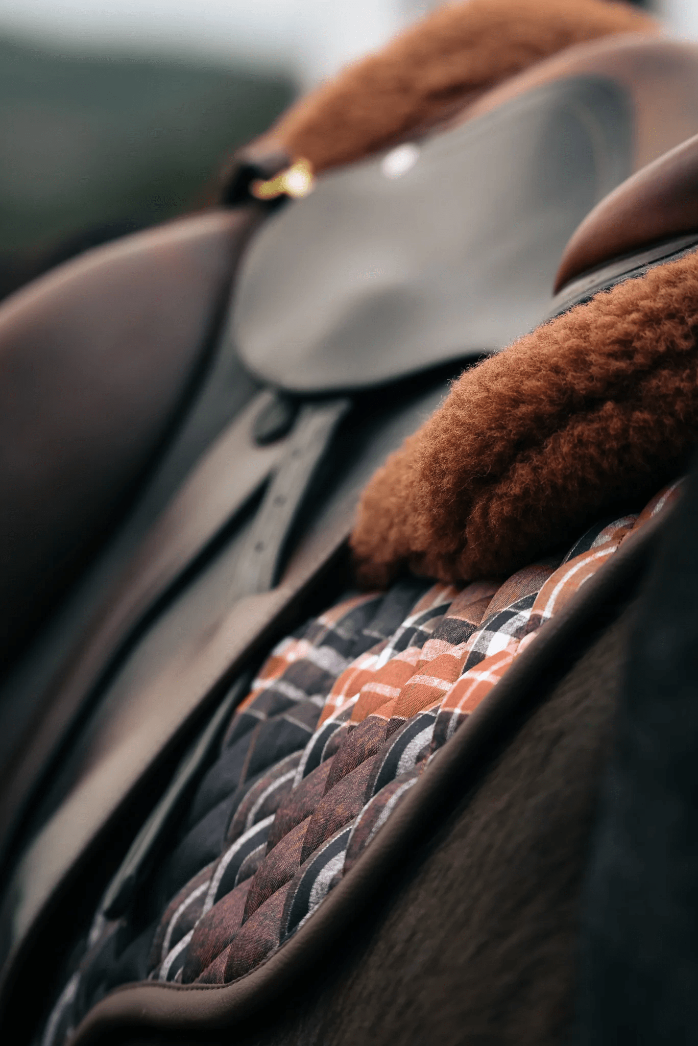 This wool fleece half pad features a quilted cotton base for comfort and support. Designed with wither relief, it's ideal for use with 16C saddle pads. Benefits include non-slip properties, shock absorption, and breathability. Easy care.