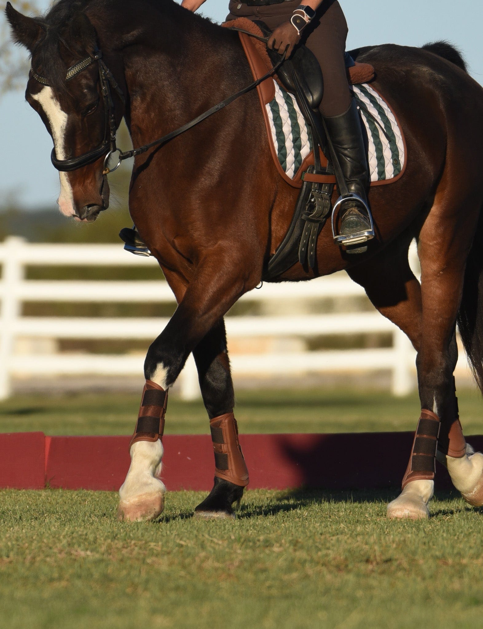 Size M fits front legs on horses 15hh–17.5hh, including stockier 15–15.2hh types.