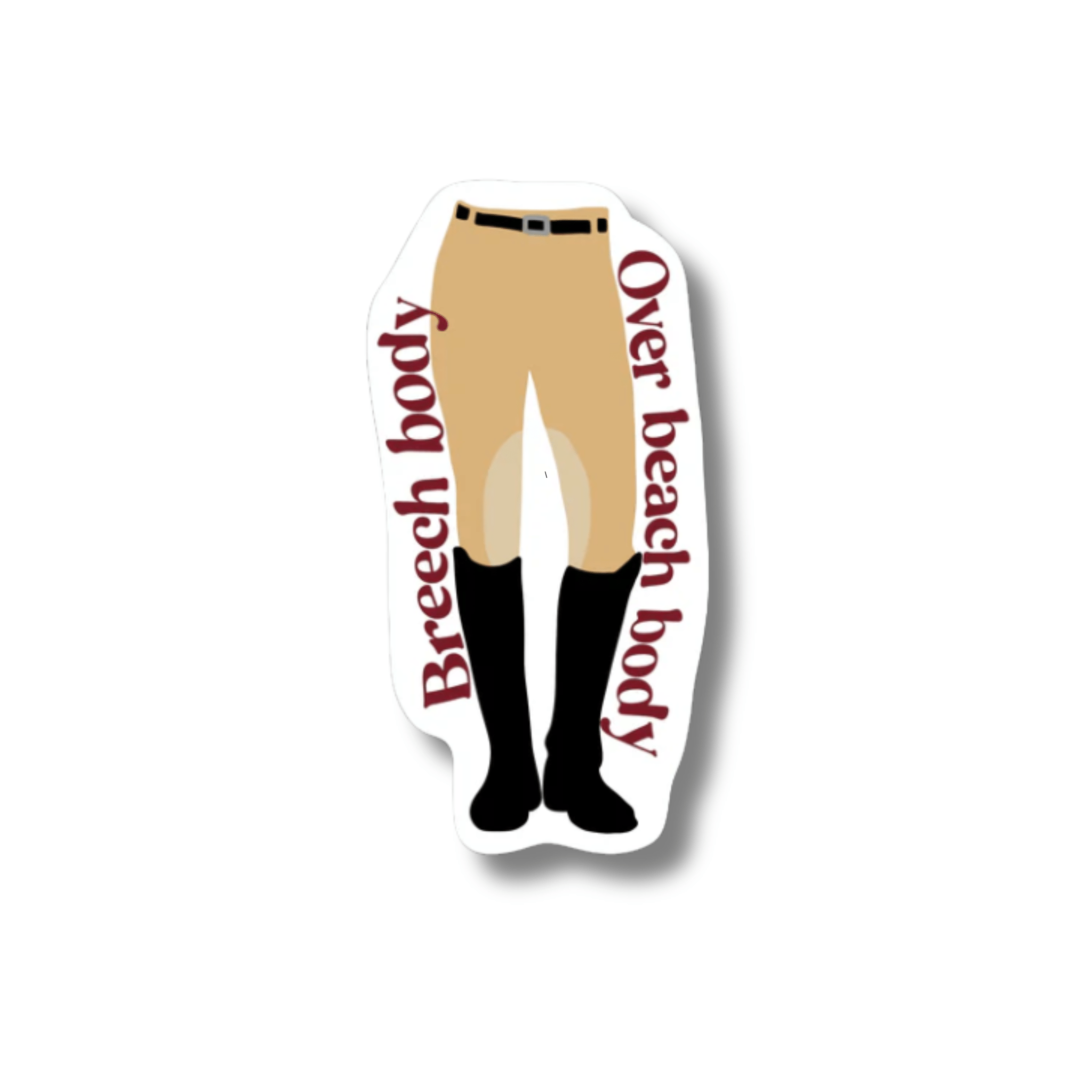The "Breech Body Over Beach Body" Vinyl Sticker is a humorous and cheeky tribute for the equestrian who prioritizes saddle season. This sticker celebrates rider pride and the reality of a "breech body"—complete with glove tan lines—over a beach body.