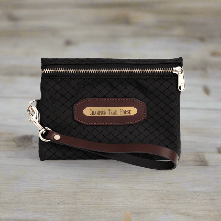 The Champions Collection was created with horse show and year-end awards in mind and each bag includes a leather accent to attach a personalized plate to. Classy and stylish for everyday use and durable enough for the barn! Each bag is created with durable black Cordura nylon and finished with Wickett & Craig leather accents. The wristlet is lined, has a length of 8” and 6” in height, and two premium metal zippers to access the pockets on each side of the bag. The wristlet also features a removable leather hand strap.