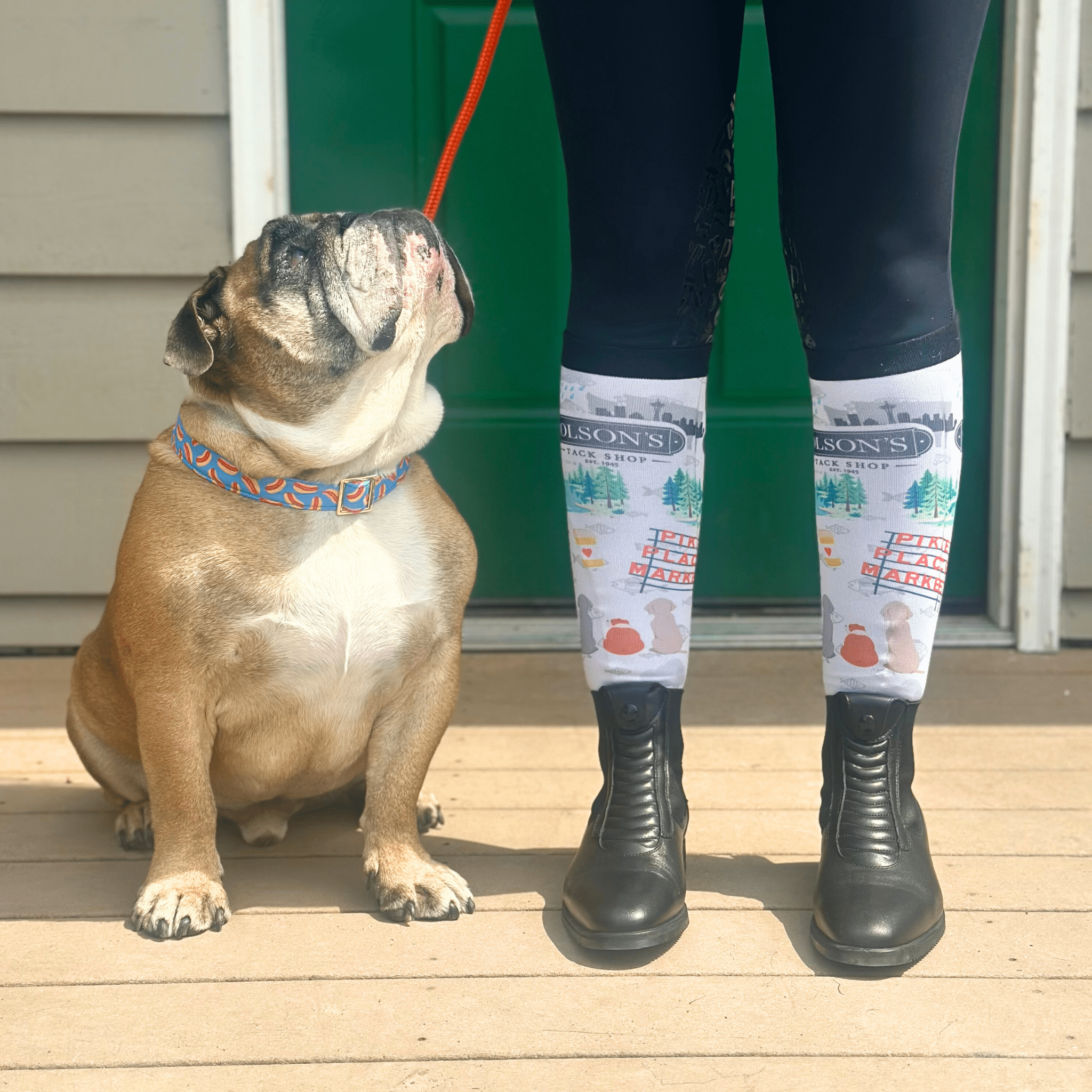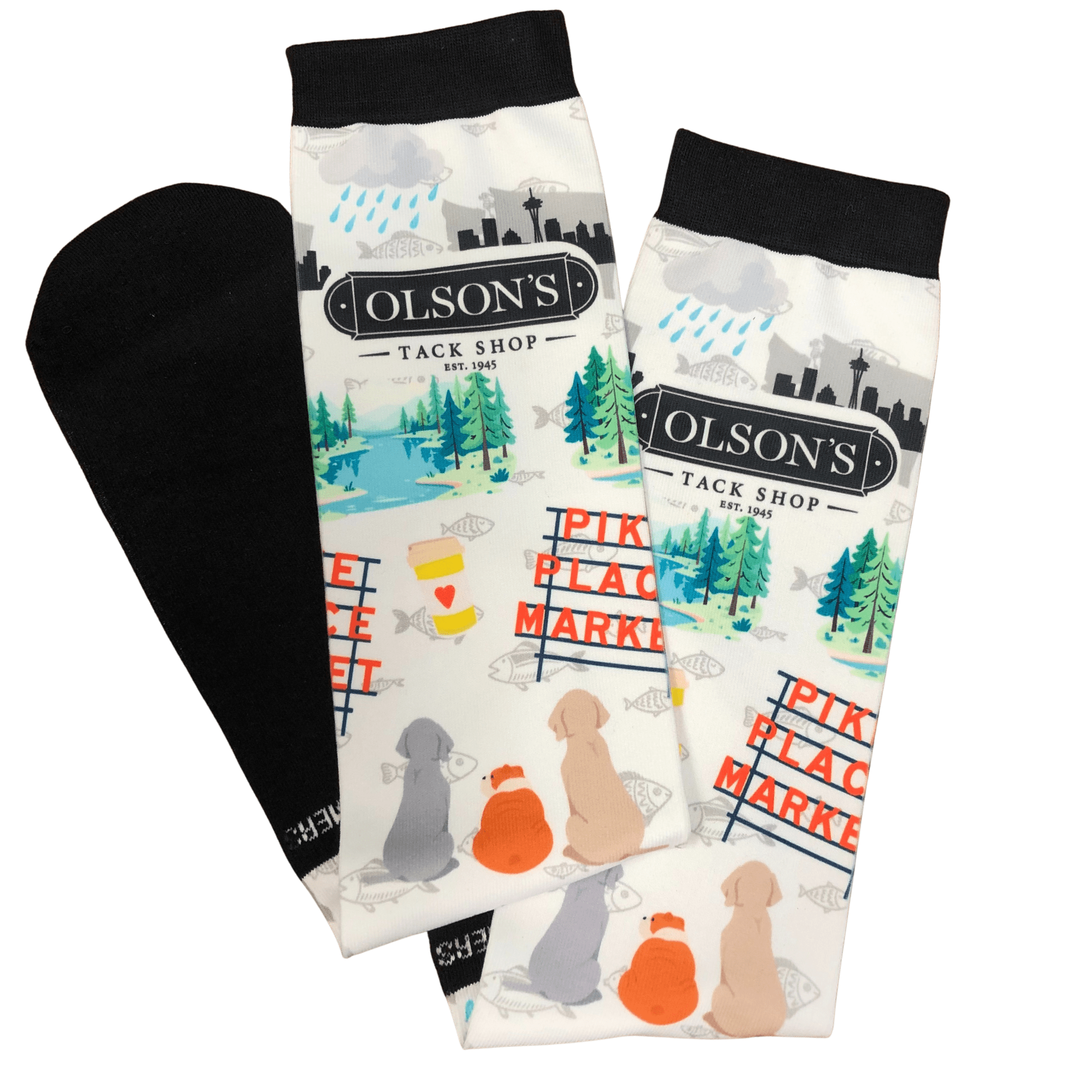 Show your love for Olson's Tack with these exclusive custom socks from Dreamers & Schemers! Featuring iconic Seattle favorites like Pike Place Market, these socks also proudly display Olson's Tack's logo and illustrations of their beloved store dogs – an English Bulldog and two Weimaraner's. These unique socks are the perfect way to add a touch of personality and local pride to your riding attire or everyday wear.