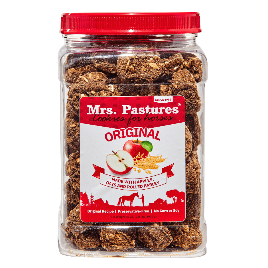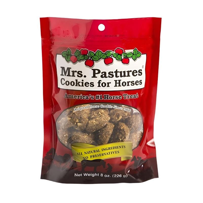 These crunchy, all natural horse cookies are the perfect reward for your perfect horse. Made from Oats, Wheat Bran, Cane Molasses, Rolled Barley, Fresh Apples and Water, and containing no preservatives, Mrs. Pasture's cookies are beloved by horses all across the country. Dehydrated for an excellent shelf life, and better durability in your pocket.