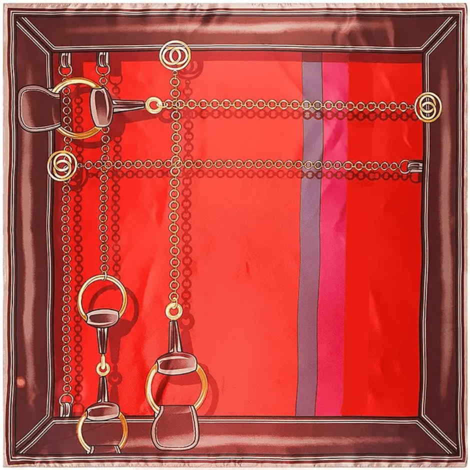 Enhance your wardrobe with our Snaffle Bit Satin Scarf. Made with a sleek silk material, this scarf exudes a designer appeal. The stylish snaffle bit design adds a touch of elegance to any outfit. Elevate your style with this luxurious accessory.