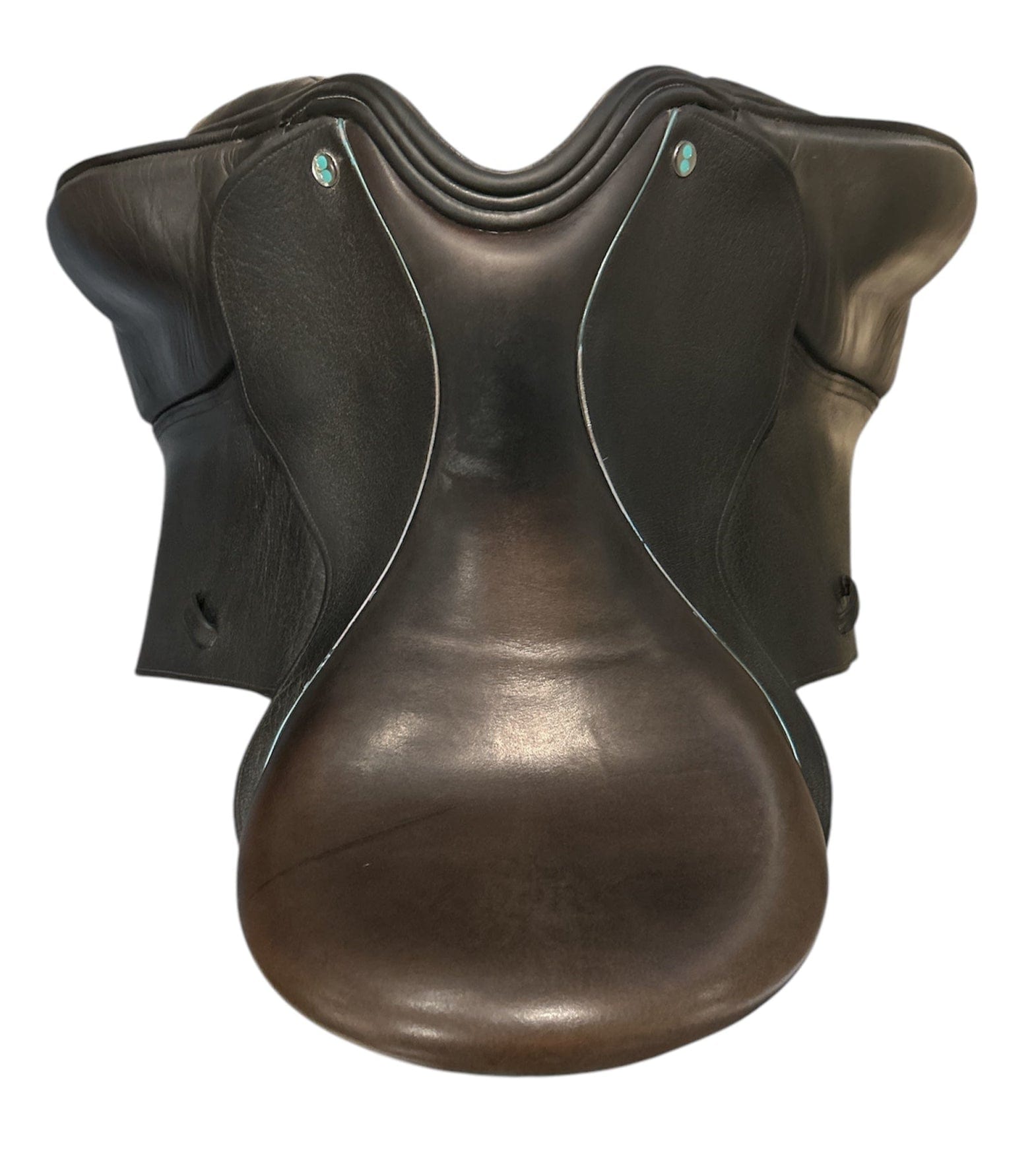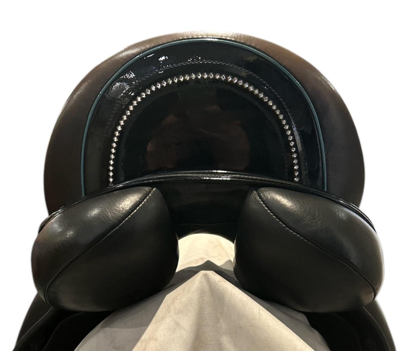 Color: Black. Teal patent piping, crystal detail on cantle.