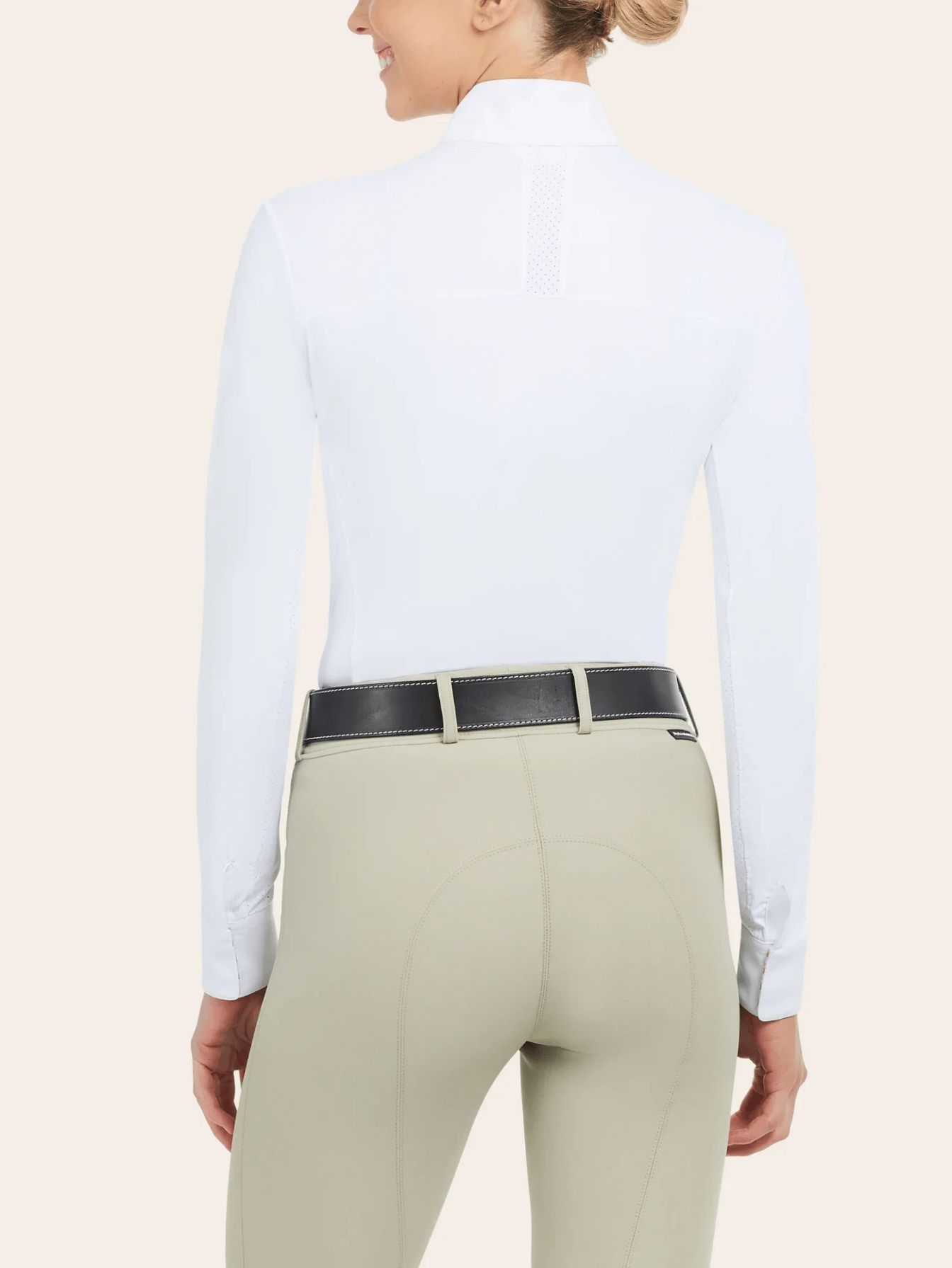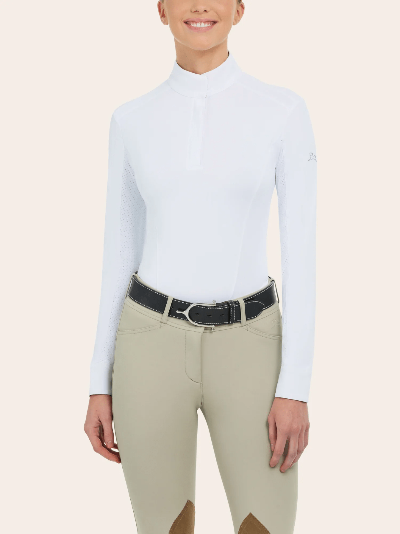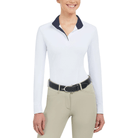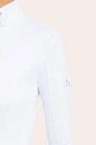 Elevate your style and performance in the show ring with the RJ Classics Tori show shirt. Made with moisture-wicking, quick-drying fabric and UPF 50+ sun coverage, this shirt offers both comfort and protection. Its sporty seam lines and modern details exude confidence, while the hidden snap collar and covered zip placket add a touch of elegance.